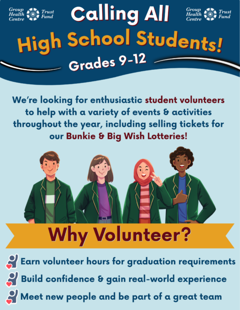 Looking for a meaningful way to get involved in your community? We’re looking for enthusiastic student volunteers to support a variety of events and activities throughout the year, including helping sell tickets for our Bunkie & Big Wish Lotteries.